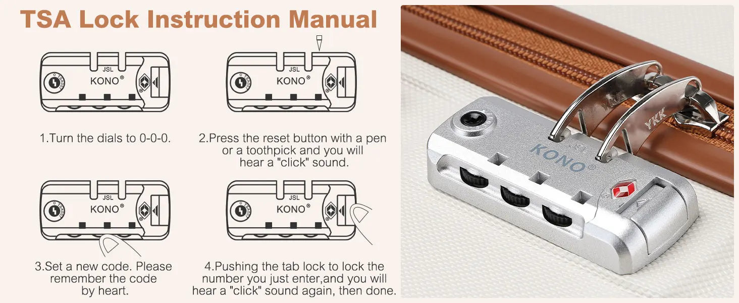 Cada maleta está equipada con una cerradura TSA integrada que permite al personal de seguridad del aeropuerto abrir el equipaje con llaves especiales si es necesario, sin necesidad de forzar la maleta. Así, su equipaje siempre estará seguro y protegido. -