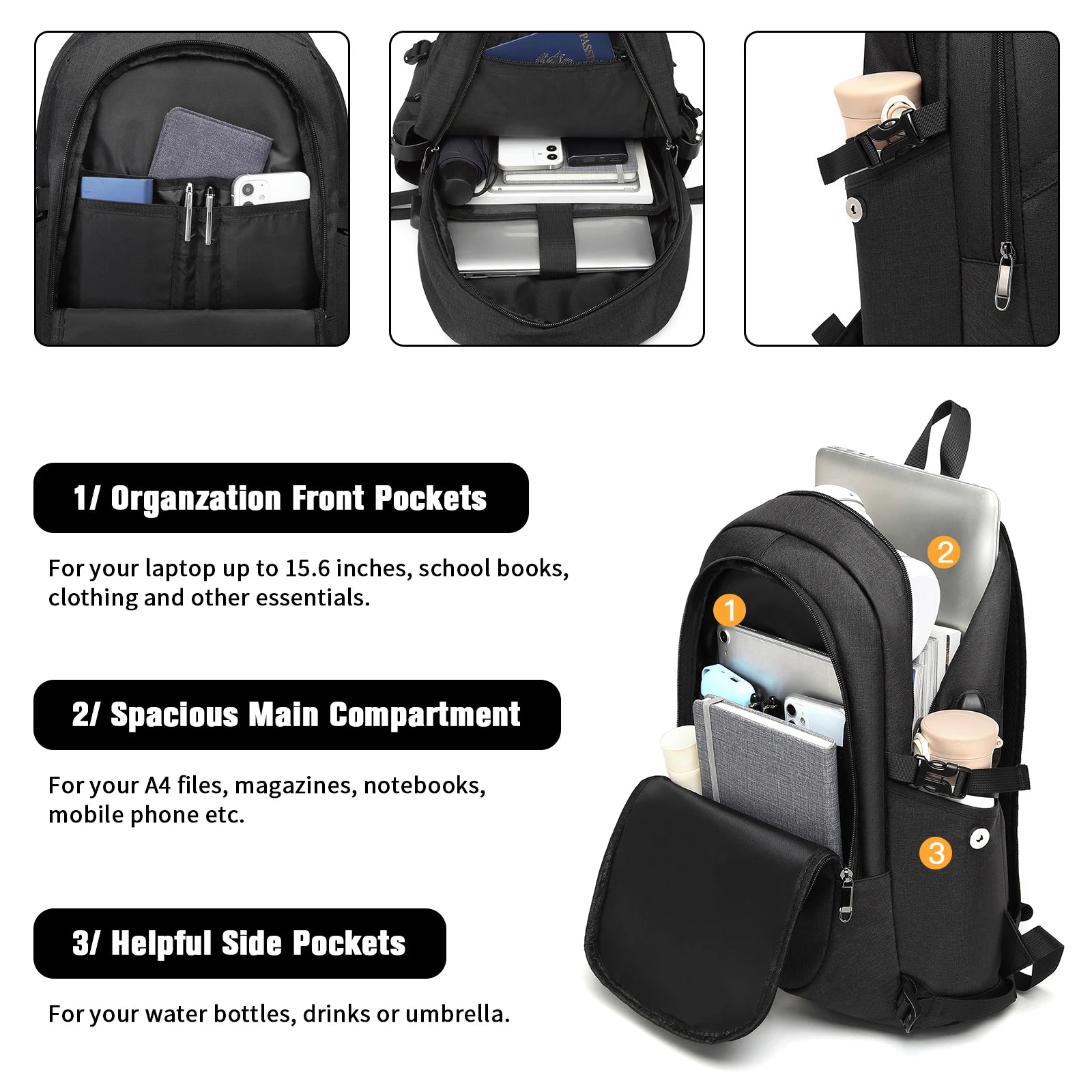 Espacioso interior: Esta mochila ofrece un amplio espacio para una computadora portátil de hasta 15,6 pulgadas, además de un abanico adicional para cámara, ropa, paraguas y documentos A4. Con 9 compartimentos interiores para tarjetas, billetera y pines, y 2 bolsillos laterales para botellas, tendrás todo perfectamente organizado.