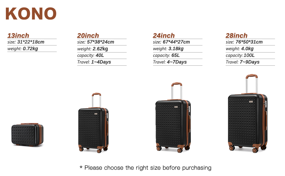 El juego de maletas Kono está fabricado con polipropileno de alta calidad. El polipropileno (ABS) es ideal para productos de aviación. Ofrece protección contra caídas, impactos y explosiones, además de una gran dureza, lo que le permite recuperarse inmediatamente después de una colisión para proteger el equipaje.