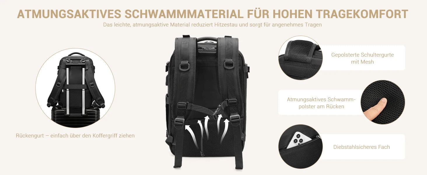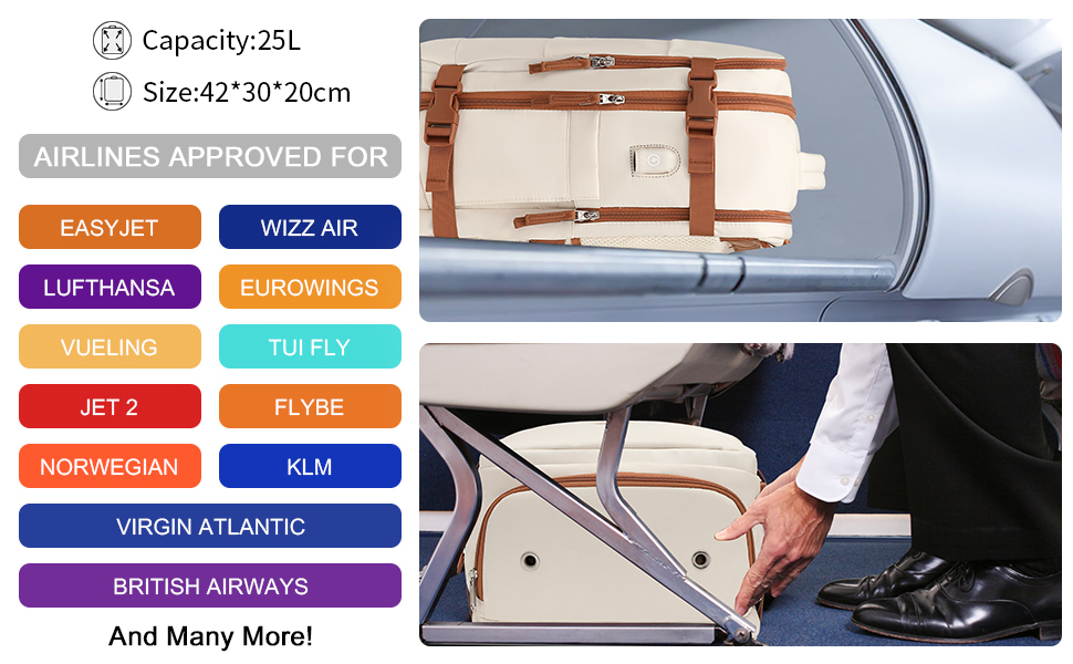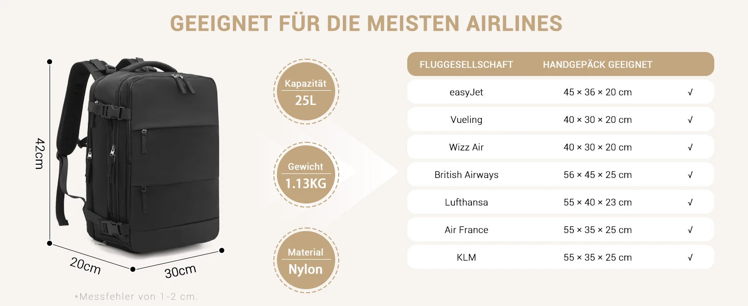 Ideal para viajes en avión: con unas de 42 × 30 × 20 cm (25 L), la mochila cumple con las normas de equipaje de mano de EasyJet y cabe fácilmente debajo del asiento del avión.